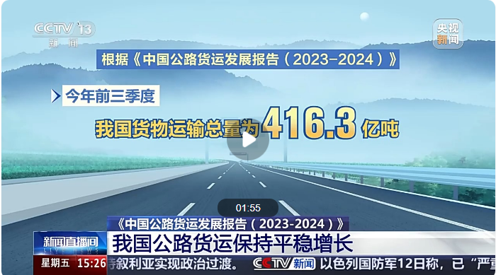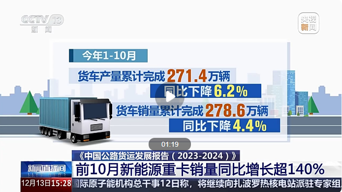 中國物流與采購聯(lián)合會今天(13日)公布《中國公路貨運發(fā)展報告(2023—2024)》。根據(jù)報告,受運輸結(jié)構(gòu)調(diào)整影響,我國公路運輸占比雖有所下降,但依然是貨運市場的主體,公路貨運保持平穩(wěn)增長。 根據(jù)報告,今年前三季度,我國貨物運輸總量為416.3億噸,同比增長2.3%。從貨運結(jié)構(gòu)來看,鐵路與水路運輸承擔的貨運量占比有所提升,公路運輸占比有所下降。前三季度公路貨運運輸量為306.6億噸,同比增長3.1%,占比超過73%,公路運輸仍然是貨運市場的主體。 中國物流與采購聯(lián)合會副會長 賀登才:公路運輸是我們整個物流體系中非常重要的一個環(huán)節(jié),它的優(yōu)勢是能夠點到點、門到門,靈活性強。調(diào)整運輸結(jié)構(gòu),有些環(huán)節(jié)離不開公路貨運。除了硬件方面使用新能源車、自動駕駛提高它的運輸效率外,現(xiàn)在通過平臺進行一些數(shù)字化改造,通過網(wǎng)絡(luò)貨運平臺及時溝通供需信息。 另外,報告指出,跨境公路運輸成為新增長點。2023年,我國跨境公路貨運市場規(guī)模約為4500億元,同比增長12%。隨著“一帶一路”建設(shè)深入推進,便利化協(xié)定實施范圍穩(wěn)步擴大,我國與蒙古國、俄羅斯及中亞各國的國際道路運輸進一步暢通,貨運量增長明顯,逐漸形成以邊境口岸為節(jié)點、覆蓋周邊國家邊境地區(qū)重要城市并向腹地不斷延伸的國際道路運輸網(wǎng)絡(luò)。 前10月新能源重卡銷量 同比增長超140% 根據(jù)《中國公路貨運發(fā)展報告(2023—2024)》,今年1—10月,我國貨車產(chǎn)銷量累計均超過270萬輛,其中新能源重卡銷量增長明顯,同比增長超過140%。 根據(jù)報告,2023年我國貨車保有量3359萬輛,同比增長1.2%。今年1—10月,貨車產(chǎn)銷量累計分別完成271.4萬輛和278.6萬輛,同比分別下降6.2%和4.4%。 與傳統(tǒng)重卡相比,新能源重卡展現(xiàn)出強大的市場活力。今年1—10月,新能源重卡累計銷量56760輛,同比增長超過140%,預計全年新能源重卡滲透率將突破8%。 中國物流與采購聯(lián)合會公路貨運分會秘書長 周志成:新能源重卡逆勢上漲,既有政策導向,也有成本的優(yōu)勢。第一,新能源相比傳統(tǒng)能源,價格優(yōu)勢比較明顯;第二,新能源電池價格下降,也降低了企業(yè)的購車成本。還有很多城市在推進新能源進城通行證的減免政策,也促進了企業(yè)新能源車的使用。