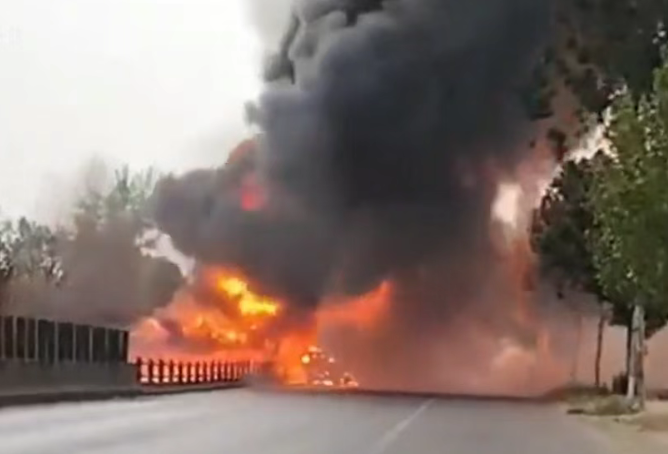 8日上午,記者從社交媒體平臺(tái)上看到,道路上黑煙滾滾,火光沖天,火勢出現(xiàn)蔓延,現(xiàn)場情形十分危急,附近還有路人遠(yuǎn)遠(yuǎn)圍觀不敢靠近。