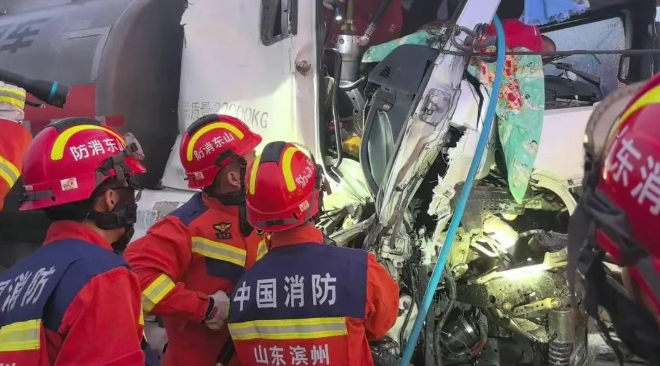 5月15日3時(shí)49分,山東濱州市消防救援支隊(duì)指揮中心接到報(bào)警稱,沾化區(qū)340國(guó)道徒駭河大橋紅綠燈附近發(fā)生一起車禍?zhǔn)鹿剩瑑扇吮焕,接警后,沾化?jīng)濟(jì)開發(fā)區(qū)特勤消防救援站立即出動(dòng)消防救援人員趕赴現(xiàn)場(chǎng)處置。消防救援人員到達(dá)現(xiàn)場(chǎng)后發(fā)現(xiàn),事故現(xiàn)場(chǎng)為一輛油罐車追尾一輛半掛車,油罐車駕駛室嚴(yán)重變形,車頭被擠扁,司機(jī)及押運(yùn)人員分別被變形的操作臺(tái)壓住右腳和左腳,無法脫困。 了解情況后,指揮員立即下達(dá)救援命令:警戒組與現(xiàn)場(chǎng)交警部門協(xié)同合作,對(duì)事故現(xiàn)場(chǎng)實(shí)施交通管制與引導(dǎo);救援組立即展開行動(dòng),決定破拆副駕駛室車門率先對(duì)押運(yùn)人員實(shí)施救援,首先利用無齒鋸對(duì)車門鉸鏈進(jìn)行切割,但鉸鏈為鑄鐵材質(zhì),一時(shí)難以割斷。 為節(jié)省救援時(shí)間,消防救援人員嘗試用拖車對(duì)油罐車駕駛室右側(cè)A柱進(jìn)行拖拽牽引,無奈效果不明顯。隨后,消防救援人員再次使用液壓破拆工具組對(duì)副駕駛室車門進(jìn)行破拆,車門被成功打開后,借助液壓擴(kuò)張鉗不斷擴(kuò)張押運(yùn)人員左腳的被卡位置,增大救援空間,經(jīng)過1個(gè)多小時(shí)的緊張救援,押運(yùn)人員被成功救出,交由現(xiàn)場(chǎng)等候的120醫(yī)護(hù)人員,送往醫(yī)院接受治療,同時(shí),被困司機(jī)的右腳也拔了出來,自行由駕駛室車門脫困,現(xiàn)場(chǎng)交通恢復(fù)正常通行。事后,從被困司機(jī)處了解到,事發(fā)時(shí)霧太大,加之前車尾燈損壞不亮,導(dǎo)致在紅綠燈路口剎車不及造成追尾。
