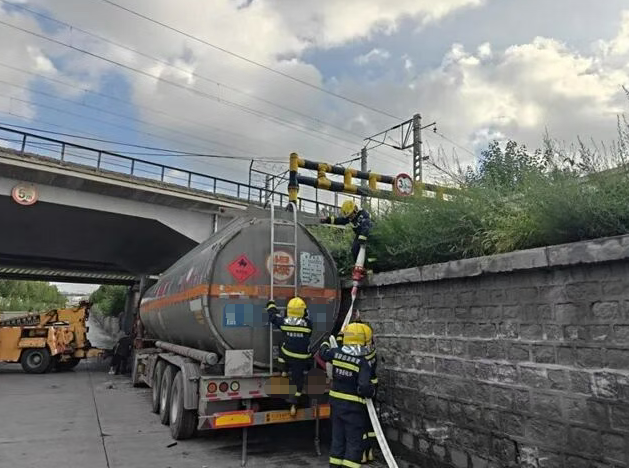 近日,山東淄博市臨淄區(qū)馮北路立交橋下發(fā)生一起三車連環(huán)碰撞事故,其中一輛為裝載33噸汽油的危險品罐車,情況十分緊急。齊魯石化隊(duì)迅速出動2輛消防車、8名隊(duì)員趕赴現(xiàn)場,發(fā)現(xiàn)其中一輛載有33噸汽油的槽車在碰撞后緊貼立交橋一側(cè)橋墩停下,而立交橋上方就是繁忙的膠濟(jì)鐵路。 汽油槽車雖暫未泄漏,但變形嚴(yán)重,如強(qiáng)行拖離,存在罐體破裂導(dǎo)致汽油泄漏的危險,一旦引發(fā)火災(zāi)或爆炸,后果不堪設(shè)想。根據(jù)現(xiàn)場情況,齊魯石化隊(duì)隊(duì)員與趕到的地方交警共同研究制定處置方案,由齊魯石化隊(duì)對槽車進(jìn)行冷卻保護(hù),保障拖車過程罐體安全,交警實(shí)施臨時管制,杜絕現(xiàn)場一切火源。隊(duì)員們立即行動,就近在立交橋一側(cè)非機(jī)動車車道鋪設(shè)水帶干線,對槽車罐壁進(jìn)行泡沫噴射和灑水降溫,防止拖車過程中,罐體與墻壁摩擦、碰撞產(chǎn)生靜電和火花引發(fā)危險。在現(xiàn)場人員的密切配合下,油罐車被安全拖離事故現(xiàn)場。